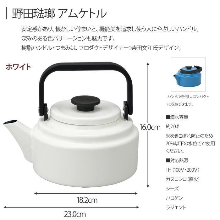 アムケトル 2L 野田琺瑯 送料無料 当日出荷 分類で探す キッチングッズ やかん・ケトル ブランドで探す 野田琺瑯 特集ページ ホーロー製品特集 ケトル 価格帯(税込) 5,000円台の商品 キッチン用品 送料無料 ラッピング承ります 安定感があり 懐かしい佇まいと 機能美を追求し使う人にやさしいハンドル ハンドルを倒しコンパクトに収納可能です 深みのあるカラーも魅力です 10000923 メーカー希望小売価格6,930円(税込) 5,544円(税込)0円 アムケトルホワイト5,544円(税込)ブラック5,544円(税込)ブルー5,544円(税込)グリーン5,544円(税込)グレー5,544円(税込)在庫なしベージュ5,544円(税込)ヤマブキ5,544円(税込)在庫なし 数量 カートに入れる 製品について性能詳細お買い物ガイドクロッカについてホーローならではの深みのあるカラーが魅力 安定感があり、懐かしい佇まいと、機能美を追求し使う人にやさしいハンドル。ハンドルを倒しコンパクトに収納可能です。深みのあるカラーも魅力です。フタにはストッパー付きで、注ぐ際に外れにくいので安心して注げます。広口タイプで給水しやすく、洗いやすい形状です。 サイズW.230×D.182×H.195 mm 満水容量2.0L吹きこぼれ防止のため約70%以下の水位でご使用ください。 重量約1000g 材質本体:ほうろう用鋼板(琺瑯加工)フタつまみ:フェノール樹脂 対応熱源IH(100V・200V) / ガスコンロ(直火) / シーズ / ハロゲン / ラジエント 生産国日本 琺瑯製品の特徴熱に強く、オーブンにかけることができます。(琺瑯部分のみ)ガラス質でコーティングしているため、においがつくにくく、清潔に保つことができます。大切に使っていただくと、つややかで美しい外面を保てます。腐食に強いため、食材の保存等に適しています。熱を逃さず、保温性にも優れています。環境ホルモンが使われていないため、体にも環境にもやさしいです。 ホーローについて手作業で釉薬を掛けるため、ひとつひとつの表情には多少の個体差が生じます。ホーローの性質上、黒点や色むらの様に見える部位が生じる場合がございます。本体の縁部分やは鋼板の切り口となるため、釉薬がかかりにくく下地の黒いスジが多少見られますが黒い部分もグランドコートというホーロー加工が施されております。上記の様な場合でも不良ではなくご使用には問題ございませんので安心してお使い下さい。 備考電子レンジ使用不可 製造元野田琺瑯RERATED ITEMS関連商品BMS シンプルケトル 2.3L BMS-2.3K 富士ホーロー富士ホーロー メリー ケトル 1.2L富士ホーロー メリー ケトル 2.0L MM-2.0K
