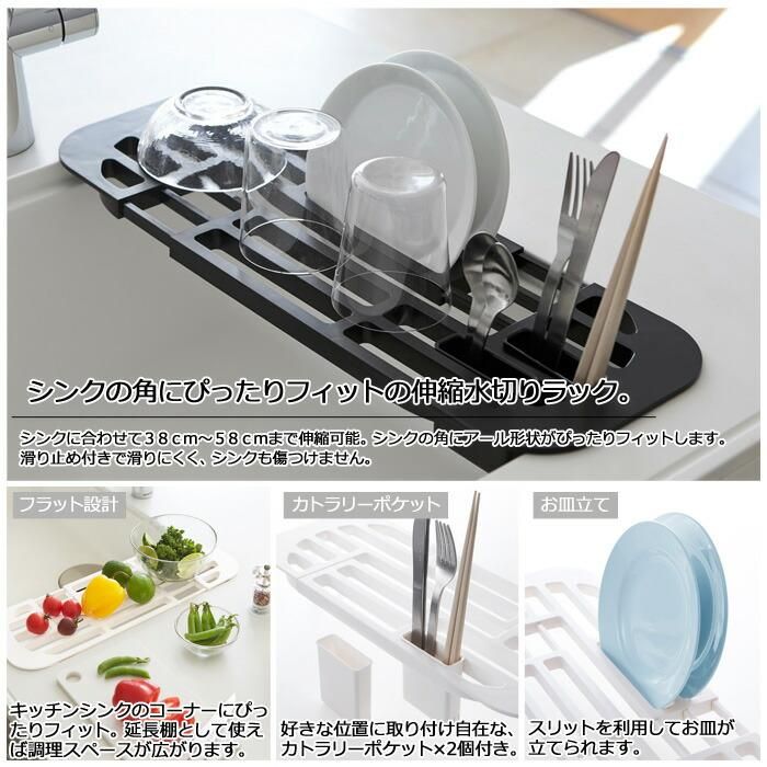 タワー 伸縮水切りラック 分類で探す キッチングッズ キッチン小物 シンクまわり 水切りカゴ・トレー ブランドで探す 山崎実業 タワー tower 価格帯(税込) 1,000円台の商品 キッチン用品 ラッピング承ります シンク角にぴったりフット シンクに合わせて38cm〜55cm(内寸)まで伸縮して調整可能 延長棚として使えば調理スペースが広がります カトラリーポケット2個付き 10001885 1,980円(税込) tower伸縮水切りラックホワイト1,980円(税込)在庫なしブラック1,980円(税込)在庫なしホワイト(取り寄せ)1,980円(税込)在庫なしブラック(取り寄せ)1,980円(税込)在庫なし SOLD OUT 製品について性能詳細お買い物ガイドクロッカについて 関連商品 キッチン収納グッズ一覧はこちらから カラーホワイト/ブラック材質ABS樹脂サイズ「W」約44〜61 × 「D」17.5 × 「H」1.6cm重量約420g耐荷重約3kg耐熱温度-40℃ 〜 90℃商品説明 シンクに合わせて38cm〜55cm(シンク内寸)まで伸縮して調整可能。シンクの角にアール形状がぴったりフィットします。 滑り止め付きで滑りにくく、シンクも傷つけません。 フラット設計でキッチンのシンクにぴったりフィット。延長棚として使えば調理スペースが広がります。 スリットを利用してお皿が立てられます。 好きな位置に取り付け自在な、カトラリーポケット×2個付き。製造 中国生産備考 カトラリーポケット2個付き 内寸 約38〜55cmまでのシンクに対応 商品説明 シンクに合わせて38cm〜55cm(シンク内寸)まで伸縮して調整可能。シンクの角にアール形状がぴったりフィットします。 滑り止め付きで滑りにくく、シンクも傷つけません。 フラット設計でキッチンのシンクにぴったりフィット。延長棚として使えば調理スペースが広がります。 スリットを利用してお皿が立てられます。 好きな位置に取り付け自在な、カトラリーポケット×2個付き。 材質ABS樹脂 サイズ「W」約44〜61 × 「D」17.5 × 「H」1.6cm 重量約420g 耐荷重約3kg 耐熱温度-40℃ 〜 90℃ 備考 カトラリーポケット2個付き 内寸 約38〜55cmまでのシンクに対応 ブランド 製造元tower -タワー 山崎実業RERATED ITEMS関連商品