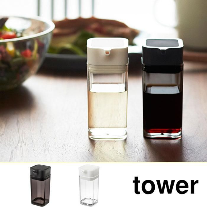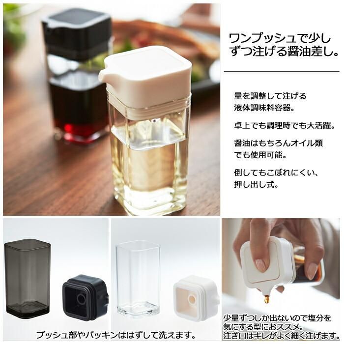 ワンプッシュで少しずつ注げる醤油差し。量を調整して注げる液体調味料容器。卓上でも調理時でも大活躍。
