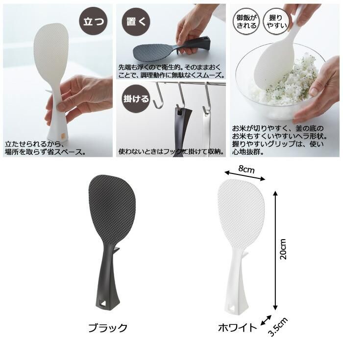 お米が切りやすく、釜の底のお米もすくいやすいヘラ形状。調理面はお米がつきにくいエンボス加工。握りやすいグリップは使い心地抜群。