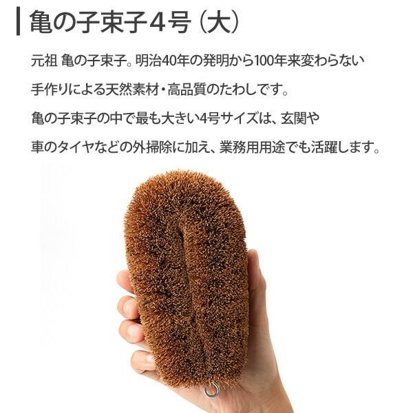 元祖亀の子束子。手作りによる天然素材・高品質のたわしです。1号よりもひとまわり大きい3号サイズは、大きな鍋・釜・まな板などを洗浄するのに最適です。広い洗浄面を活かして浴室でのお掃除にも活躍します。