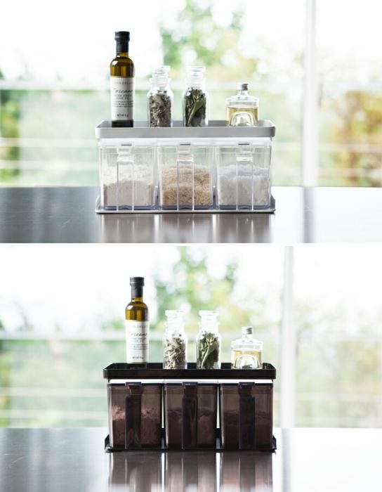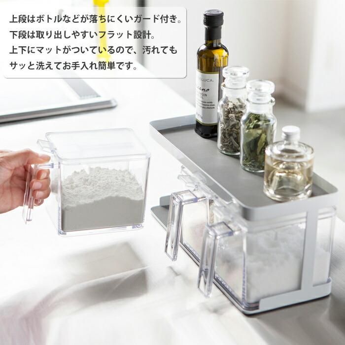 すり切り板で簡単に計量できる調味料ストッカー3個セット。上段は市販のボトルなどを収納可能。ガード付きで安心。