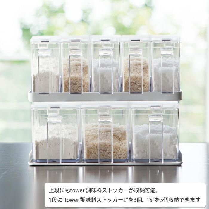 下段はフラット設計で出し入れがスムーズに行えます。上下にマット付きで汚れてもサッと洗えます。調味料ストッカー タワーLサイズが3つ、Sサイズ(別売)が5つ収納できます。