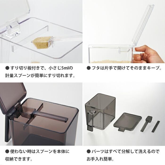 パーツはすべて分解して洗えてお手入れ簡単。しお・さとう・小麦粉の日本語と英語のシールが各1枚と書き込みができる無地シール2枚付き。蓋は片手で開けてそのままキープ。