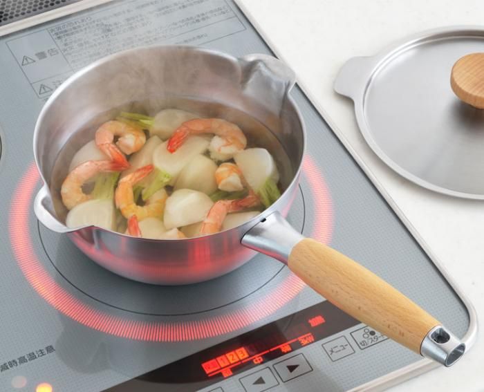 特長的な注ぎ口が付いた、丈夫でお手入れ簡単なステンレス製の雪平鍋