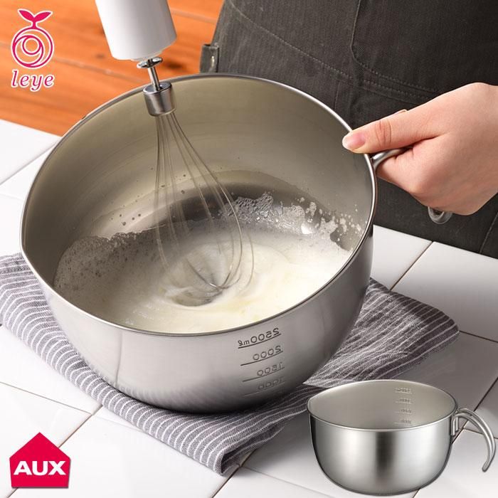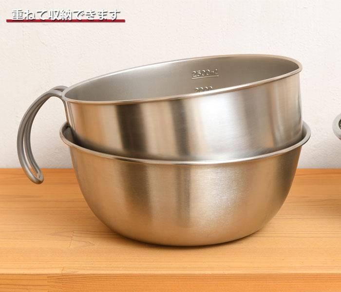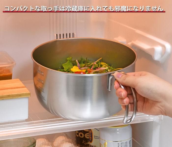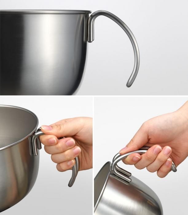 持ちやすさ、注ぎやすさ、ボウルの固定に配慮して設計された、取っ手付きステンレスボウル