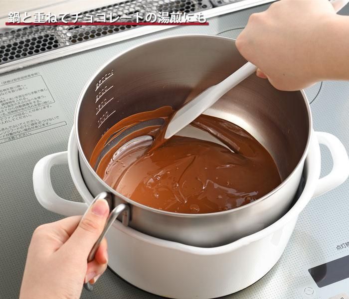 取っ手は角度、形状、取り付け位置を持ちやすさ、注ぎやすさ、ボウルの固定に配慮して設計されています。清潔でさびにくい18-8ステンレス製。底面積があり安定感がある形状です。