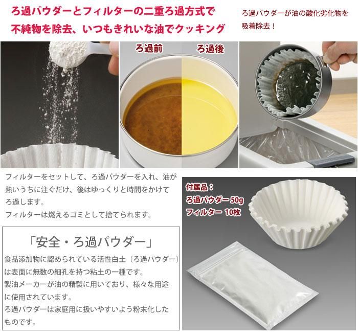 ろ過パウダー 50g フィルター 10枚 約10回分 TD8 当日出荷 分類で探す キッチングッズ キッチン小物 調理ツール キッチン小道具 その他キッチン小道具 ブランドで探す オークス AUX 価格帯(税込) 1,000円以下の商品 キッチン用品 送料無料 ラッピング承ります ろ過パウダー50gとフィルター10枚のセット オークス ウチクックのクイックフライヤーやロカポットにご使用いただけますaux-uchicook-td8 880円(税込) TD8在庫880円(税込)在庫なし取り寄せ880円(税込)在庫なし SOLD OUT 製品について性能詳細お買い物ガイドクロッカについて サイズ約 幅12.8×奥行8×高さ15.7cm(パッケージサイズ) 材質フィルター:ろ紙ろ過パウダー:活性白土(ムサシライトS) セット内容ろ過パウダー50g(約10回分)、フィルター10枚 商品説明ろ過パウダー50gとフィルター10枚のセットです。活性白土のろ過パウダーが使用済み油の汚れを吸着し、きれいにします。1回1杯(5g)の使用で約10回ご利用いただけます。ろ過パウダーとフィルターは使用ごとに交換してください。 備考日本製 ブランドAUX -オークスRERATED ITEMS関連商品ウチクック クイックフライヤー UCS2ウチクック ロカポット UCS1富士ホーロー オイルポット用 活性炭カートリッジ 3個入り OP-KT3富士ホーロー オイルポット 1.5L