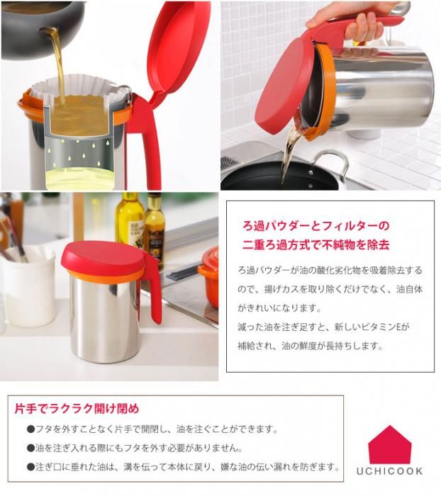 ウチクック ロカポット UCS1 送料無料 当日出荷 分類で探す キッチングッズ キッチン小物 オイルポット ブランドで探す オークス AUX ウチクック UCHICOOK 価格帯(税込) 7,000円台の商品 キッチン用品 送料無料 ラッピング承ります スタイリッシュなデザインのステンレスオイルポット 蓋を外すことなく片手で注げます 注ぎ口は二重構造で 伝いもれしない ろ過パウダーとフィルターの二重ろ過方式aux-uchicook-ucs1 7,150円(税込)0円 UCS1レッド7,150円(税込)ブラック7,150円(税込)在庫なしレッド(取り寄せ)7,150円(税込)在庫なしブラック(取り寄せ)7,150円(税込)在庫なし 数量 カートに入れる 製品について性能詳細お買い物ガイドクロッカについてウチクック ロカポット UCS1 商品説明キッチンになじむスタイリッシュなデザインのステンレス製オイルポット。ろ過パウダーとフィルターの二重ろ過方式で揚げた後の油の不純物を除去します。蓋を外すことなく片手で油を注げます。注ぎ口は二重構造で、伝いもれを防ぎ収納場所を汚しません。 サイズ約 幅14×奥行19×全長20.1cm 適正容量0.6L 材質本体:18-8ステンレスフィルター受け:18-0ステンレスハンドル・注ぎ口:66ナイロンフィルター:ろ紙ろ過パウダー:活性白土(ムサシライトS)計量スプーン:ポリプロピレン 付属品ろ過パウダー50g(約10回分)、フィルター10枚、計量スプーン1個 重量約530g 特長ろ過パウダーが使用済み油の微細な汚れまで吸着し、時間をかけてじっくり濾過します。使うたびに減った分の油を注ぎ足すことにより油を捨てる回数が減り、油の購入回数も減ります。二重の注ぎ口なので伝い漏れしにくく、収納スペースを汚しません。 備考日本製 ブランドUCHICOOK -ウチクック オークスRERATED ITEMS関連商品ろ過パウダー 50g フィルター 10枚 約10回分 TD8ろ過パウダー 300g フィルター 60枚 約60回分 TD7富士ホーロー オイルポット用 活性炭カートリッジ 3個入り OP-KT3富士ホーロー オイルポット 1.5L