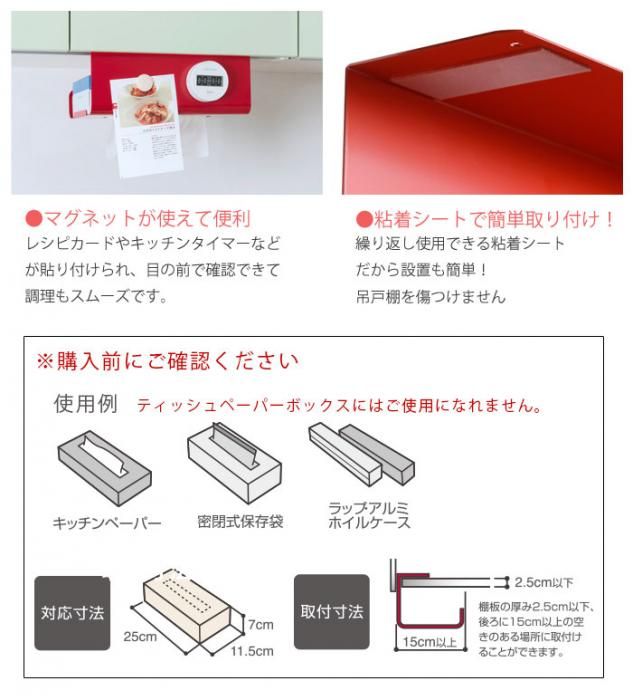 ウチフィット キッチンボックスホルダー UFS4 送料無料 当日出荷 分類で探す キッチングッズ キッチン収納 ペーパーホルダー ブランドで探す オークス AUX ウチフィット UCHIFIT 価格帯(税込) 3,000円台の商品 キッチン用品 送料無料 ラッピング承ります 吊戸棚下に簡単取り付け ボックスタイプのキッチンペーパーや箱入りの保存袋の収納にも便利 繰り返し使用できる粘着シートだから設置も簡単で吊戸棚を傷つけませんaux-uchifit-ufs4 3,850円(税込)0円 ボックスホルダーホワイト3,850円(税込)在庫なしレッド3,850円(税込)在庫なしシルバー3,850円(税込)在庫なし SOLD OUT 製品について性能詳細お買い物ガイドクロッカについてUCHIFIT キッチンボックスハンガー UFS4 商品説明キッチンペーパーのボックスを吊戸棚下に簡単取り付け。箱入りの保存袋なども便利に収納。鋼板なので、レシピやメモ紙をマグネットで貼り付けられます。繰り返し使用できる粘着シートだから設置も簡単で吊戸棚を傷つけません。 サイズ幅26×奥行15×高さ11.5cm 材質本体:鋼板(アクリル樹脂焼付塗装)粘着シート:PETフィルム 重量約0.9kg 対応サイズボックスは、幅25cm×奥行11.5cm×高さ7cm以内のものをご使用ください。棚板の厚み2.5cm以下、後ろに15cm以上の空きがある場所に取り付けることができます。ティッシュペーパーボックスにはご使用になれません。 特長サッと脇から入れるだけキッチンペーパーのボックスタイプや袋タイプに対応。保存袋なども便利に収納できます。マグネットが使えて便利レシピカードやキッチンタイマーなどが貼り付けられ、目の前で確認でき調理もスムーズ。取り付けかんたん繰り返し使用できる粘着シートだから取り付けも簡単。吊戸棚を傷つけません。 備考日本製 ブランドUCHIFIT -ウチフィット オークスRERATED ITEMS関連商品トスカ 戸棚下キッチンペーパーホルダー 2418トスカ キッチンペーパーホルダー&タオルハンガー 3373