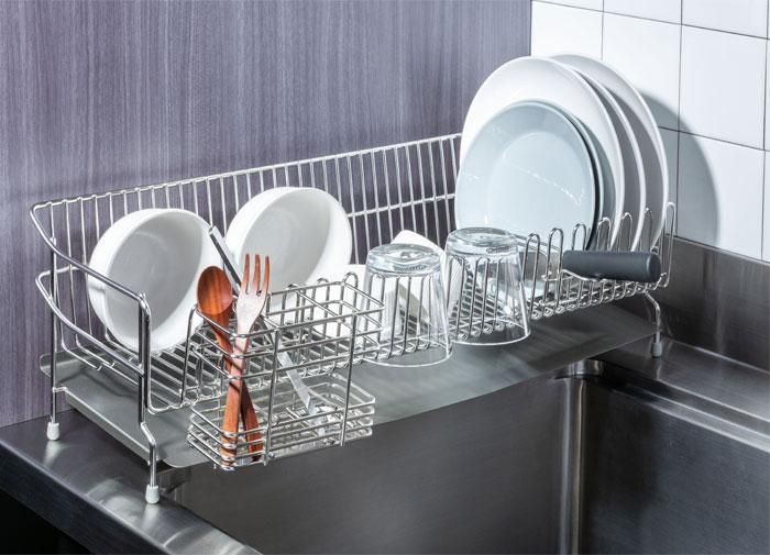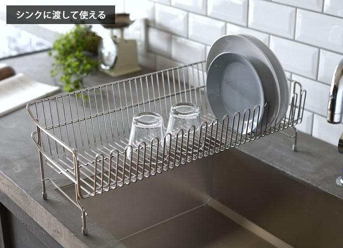 置くだけでキッチンがおしゃれに、スタイリッシュになる上質で大容量の水切りカゴです。全てのパーツに18-8ステンレスを使用し、さびにくく、高級感あふれる質感です。
