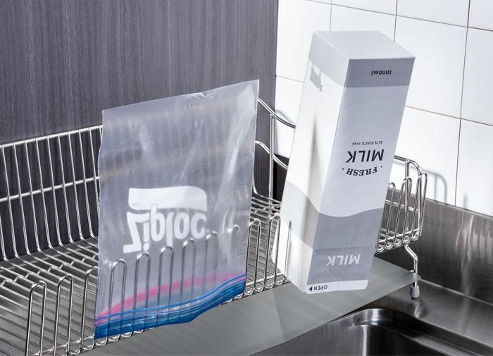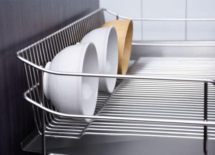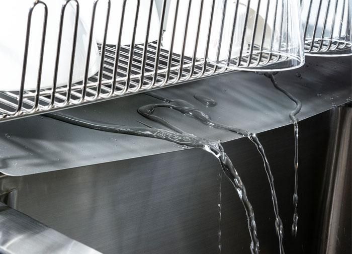水は傾斜したトレーによってシンク内に流れます。表面にシリコーンコーティングを施した水受けトレーは、食器からのしずくを気持ちよく流します。また水垢も付きにくく、サッとひと拭きで落とせます。