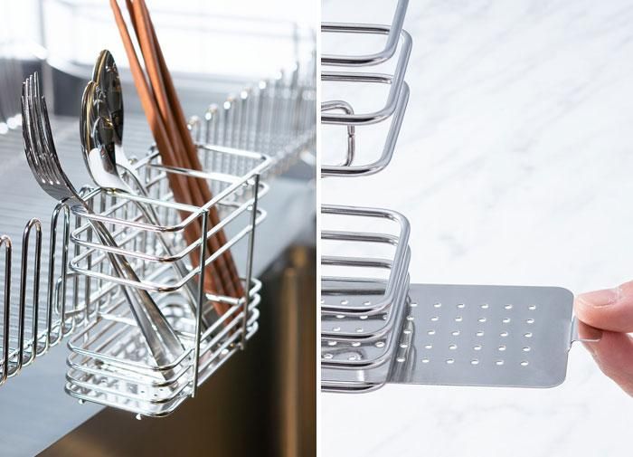 フック式ではなく差し込み式なので、ガタつきなく固定でき、安心してお使いいただけます。カトラリースタンドの底パーツは取り外してお手入れができます。