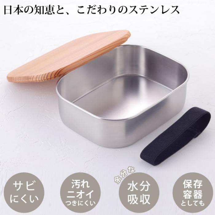 この商品は、そんな経木の力を活かしたお弁当箱。木蓋に樹齢200年の古代杉を、本体には新潟燕三条のステンレスを使用。