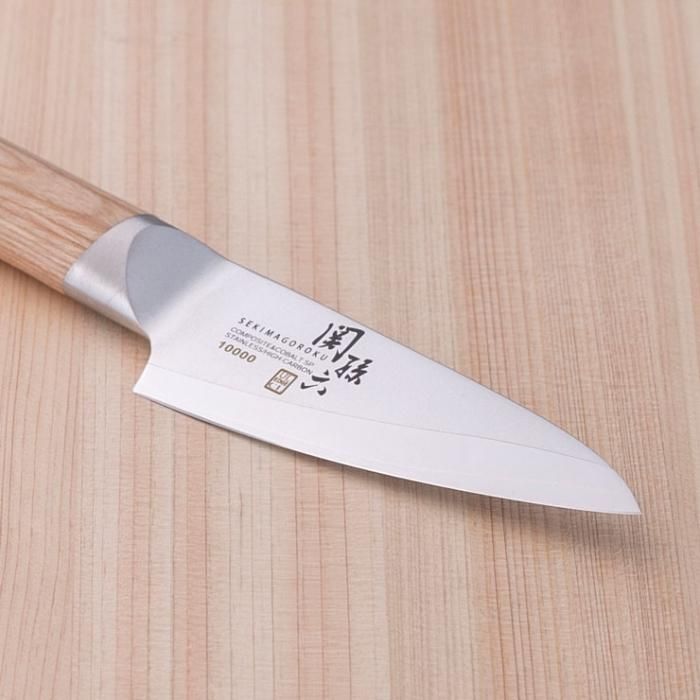 関孫六,10000CL,ペティーナイフ,90mm,AE5250,貝印 ステンレス刃物鋼にコバルトを含有させることで、耐食性、耐摩擦性、高靱性、と多面的な強さを実現 特殊精密接合(ろう付け)の技術を利用し、背側と刃側のコントラストで刃の波紋とハンドルは白合板を採用したデザイン性を表現 優しい印象の白合板を用いたハンドル