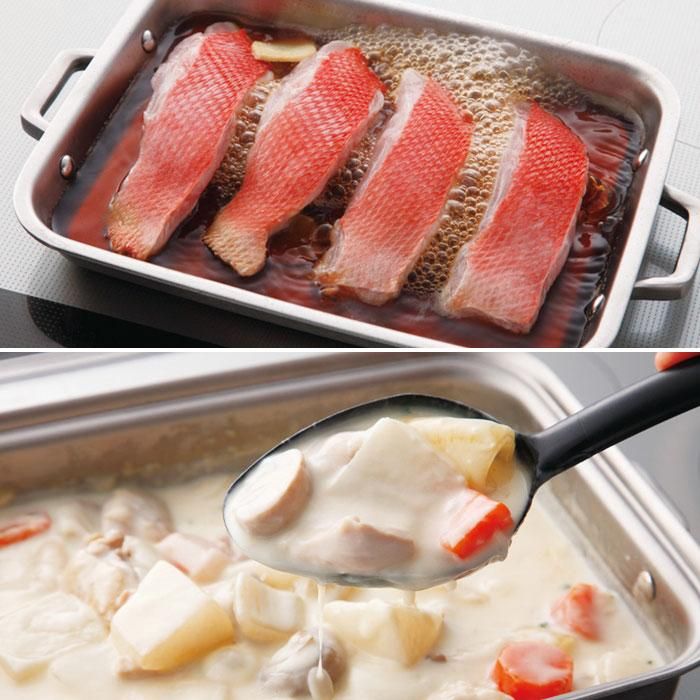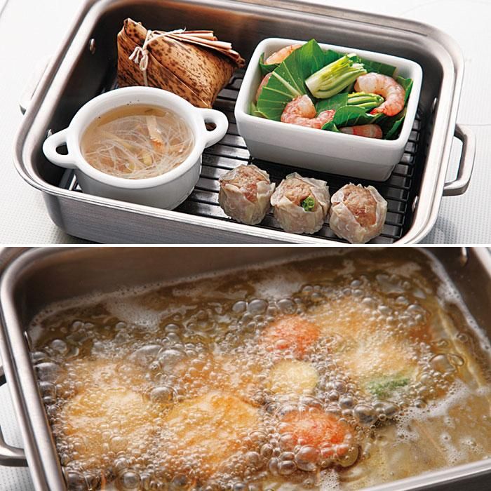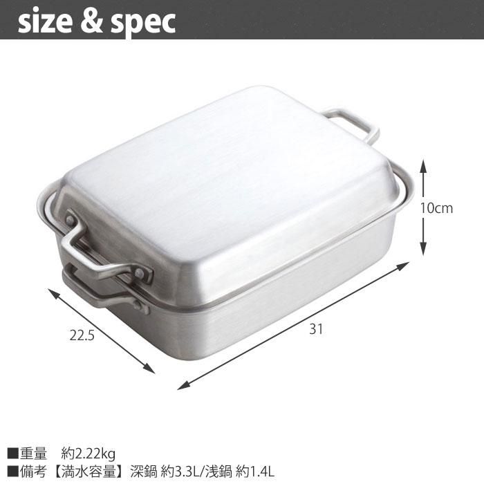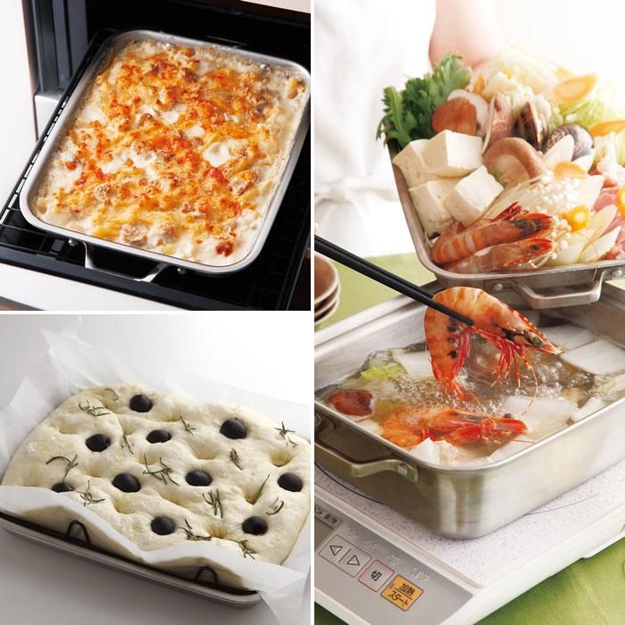 - 浅鍋と深鍋を組み合わせて使うことで、様々な料理ができる角型の両手鍋