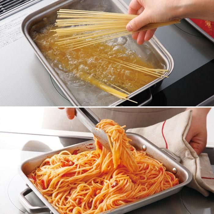 浅鍋で具材を炒め、ソースを用意しておけば、後は茹であがったパスタをトングで移して和えるだけと便利です。