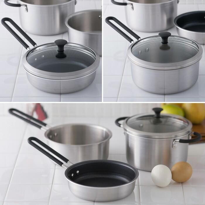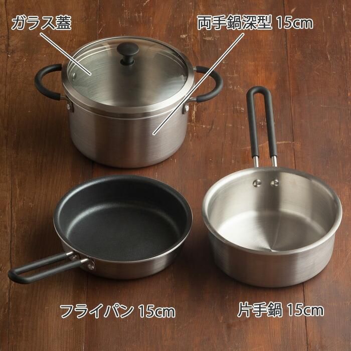 フライパン 15cm、片手鍋 15cm、両手鍋深型 15cm、ガラス蓋