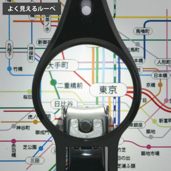 刀匠関孫六の伝統から生まれたツメキリ。大きなルーペで刃先が拡大され、さらにLEDライトが付いているのでより見やすくなっているツメキリです。