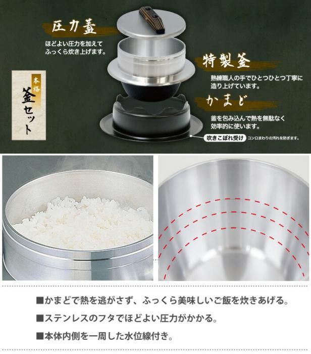 かまどで熱を逃がさず、ふっくら美味しいご飯を炊き上げます。釜は熱伝導の良いアルミニウムキャスト製で、短時間で温度が上昇します。
