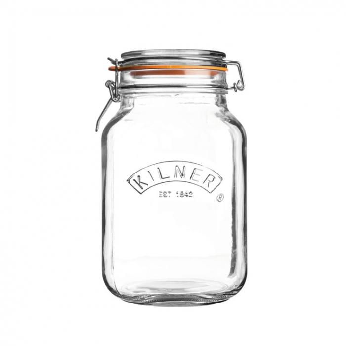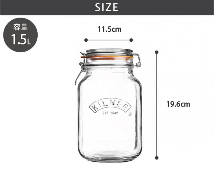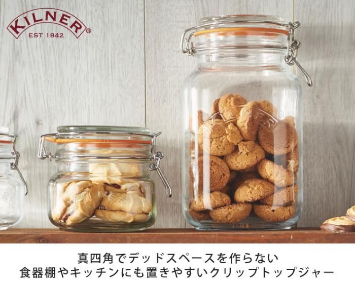 不動の人気のクリップトップジャーはキルナーのロゴマークが正面にエンボスされたクラシックなデザインです。