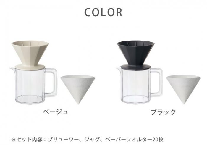 アウトドアで気軽にコーヒーを楽しめる、ブリューワーとジャグのセット。