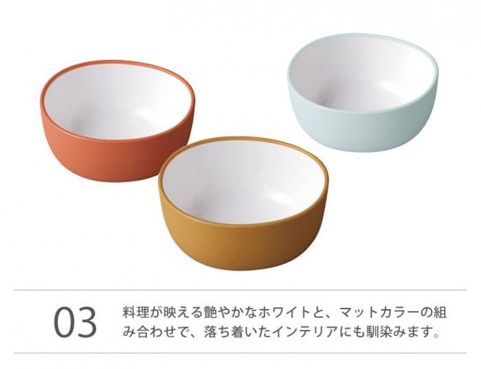 食器の内側は料理が映える艶やかなホワイト、外側はマットな質感を持つカラーの組み合わせで、落ち着いたインテリアにも馴染みます。