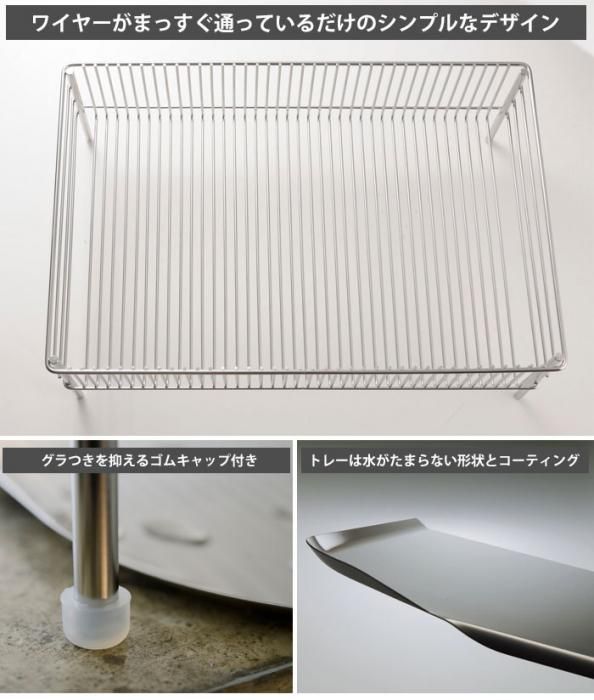 ななめに傾いているので、洗い物の水がトレーにたまらず、シンクに流れ落ちます。縁に巻き込みが無いので、汚れがたまらず、洗いやすく清潔です。