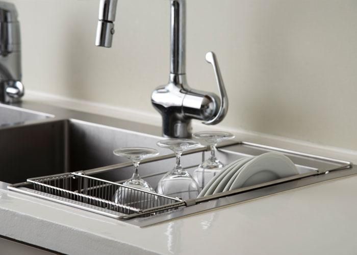 水切りかごが置かれるシンク脇は本来、作業台として使うスペース。ここを広く取りたいという人は多いはずです。そこで、水切りかごをシンクの中に入れ、作業台のスペースをすっきりさせたいという思いからシンクインバスケットが誕生しました。