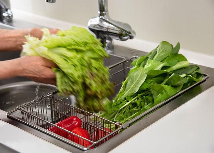 シンクに水切りかごが入ることで、食器の水切り以外にもザルの役目も果たします。絶妙なワイヤーの間隔なので野菜の水切りとしてもちょうど良いサイズです。