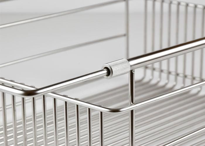 底面のワイヤーを交差させずに大皿が入るように設計されています。一般的な水切りにある縦横に交差する補強ワイヤーを使わずに、溶接部分を少なくすることで汚れがたまりにくく清潔に使えます。