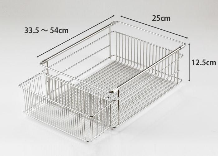 使用時は横からバスケットが見えないので見た目もすっきり。バスケットに入れた食器類も目立ちません。シンクにかけるアームは約335〜540mmの範囲で伸縮させることができます。