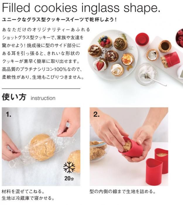 ルクエ クッキーグラス 8個入り 送料無料 当日出荷 分類で探す キッチングッズ キッチン小物 製菓用品 ケーキ・お菓子型 ブランドで探す ルクエ 価格帯(税込) 4,000円台の商品 キッチン用品 送料無料 ラッピング承ります ユニークなグラス型クッキースイーツで乾杯 小さなグラス形状のクッキーをつくり 中にクリームやフルーツを詰め込んで オリジナルのスイーツを楽しめます lekue-007999 4,400円(税込) 0円 数量 カートに入れる 製品について性能詳細お買い物ガイドクロッカについて ユニークなグラス型クッキースイーツで乾杯しよう! 丈夫で柔らかいプラチナシリコン型だから実現した、新しいクッキーの楽しみ方。小さなグラス形状のクッキーをつくり、中にオリジナルのクリームやフルーツを詰め込んで、オリジナルのお菓子を楽しめます。あなただけのオリジナリティーあふれるショットグラス型クッキーで、家族や友達を驚かせよう!焼成後に型のサイド部分にある耳を引っ張ると、きれいな形状のクッキーが素早く簡単に取り出せます。高品質のプラチナシリコン100%なので、柔軟性があり、生地もこびりつきません。 届いてすぐに楽しめる、基本の使い方とレシピアイデア集付き。 使用上のご注意 1.電子レンジ、オーブン、食器洗浄機でご使用になれます。2.最初に使用する前に、中性洗剤で製品をよく洗ってください。3.初回使用時に軽く油分を塗っておくと、型くずれしにくくなります。4.直接炎にあてたり、火のそばに置かないでください。5.オーブンを使用する場合は、下段に置いてください。6.お手入れの際、タワシや研磨剤入りの洗剤は使用しないでください。7.ナイフなどの刃物で傷をつけないでください。 プラチナシリコンとは医療機関における機器や乳幼児の口に触れる商品などにも使用されている安心な素材です。 ガラスと同じ二酸化ケイ素が主原料でゴム特有のにおいがなく、油や酸にも強く食材と化学反応を起こしません。耐熱温度もマイナス20℃から220℃(日本国内で試験済み)と広範囲なので、電子レンジや食洗機にも使用できます。 サイズ(約)φ5.0×H6.8cm/1個 容量(約)40ml/1個 材質シリコーンゴム 耐熱,耐冷耐熱温度:220℃耐冷温度:-20℃ 生産国中国 備考 食洗機使用可 電子レンジ使用可 BPAフリー ブランドLekue -ルクエRERATED ITEMS関連商品タイガークラウン ウィズ シリコンスプーン 7236タイガークラウン ウィズ シリコンゴムヘラ 大 1610タイガークラウン ドレッジ 7019タワー 電子レンジ庫内汚れ防止シリコンマット 5039/5040貝印 BreadySELECT パン焼き型 クマ DL7015すみっコぐらし 立体チョコ型(しろくま-ぺんぎん-とんかつ-ねこ-とかげ) DN0505すみっコぐらし だっこクッキーセット しろくま&ふろしき DN0501/とんかつ&えびふらいのしっぽ DN0502すみっコぐらし 抜き型セット (ぺんぎん?-ねこ-とかげ) DN0500