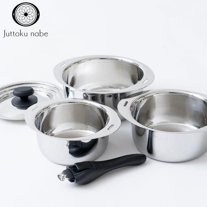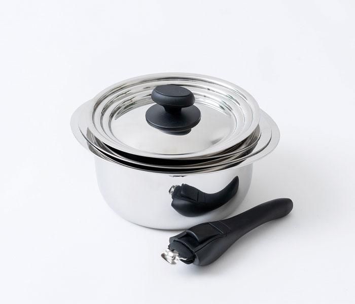 十得鍋 セット JN-ST-1 ソースポット16・18・20cm 送料無料 当日出荷 分類で探す キッチングッズ フライパン その他フライパン ブランドで探す 宮崎製作所 価格帯(税込) 2万円台の商品 キッチン用品 送料無料 ラッピング承ります 毎日料理する人の使い勝手と快適なキッチンライフを考えた十の得が詰まった調理道具「十得鍋」 16 18 20cmのソースポットと3サイズに使える兼用蓋とハンドルのセット miyaco-jn-st-1 メーカー希望小売価格27,500円(税込) 22,000円(税込) 0円 数量 カートに入れる 製品について性能詳細お買い物ガイドクロッカについて ずっと使える、重なるお鍋 シンプルだけど機能的 毎日料理する人の使い勝手と快適なキッチンライフを考えた十の得が詰まった調理道具「十得鍋」「これさえあれば」の基本のお鍋のサイズをセットにしました。16、18、20cmのソースポットと3サイズに使える兼用蓋とハンドルのセットです。 重なる収納美お鍋を重ねられるので、食器棚やシンク下のわずかなスペースにコンパクトに収まります。鍋を重ねても鍋底が接しない設計で傷がつきにくく、永く使えます。 継ぎ目のない美しいデザイン凸凹がないシンプルなデザインは、接合部分がなく汚れが溜まりにくく洗いやすくて、お手入れが楽チンです。 安心設計で便利な着脱ハンドル片手で着脱でき、装着してもハンドル部分が鍋の中に入らない衛生的な構造の安心・安全ハンドルです。 職人技のミラー仕上げ新潟県燕市の研磨技術を活かした表面ミラー仕上げで、汚れがつきにくく落としやすいです。 ムラなく熱が伝わる製品構造熱伝導が良いアルミを保温性の高いステンレスで挟んだ、全面アルミ芯三層鋼。揚げ物は短時間でカラッと揚がり、弱火調理ができるから煮物は煮崩れません。 省エネ料理保温性が高く、弱火で温度を保ったまま調理ができます。余熱で煮込む余熱調理も得意です。手間をかけずに、熱量を小さく抑えながら短時間で料理ができます。 広がる料理バリエーションオーブンに入れてケーキを焼いたり、サイズの違う鍋を重ねて、湯せん鍋としても使えます。また、別売りのフライパンや蒸し器を使えば様々な調理に活かせます。 全ての熱源に対応ガスはもちろん、200Vの電磁調理器(IH)、ハロゲンヒーターにも対応。オーブンにも入れられます。 無水調理・無油調理が可能ウォーターシール効果で美味しく調理できます。少量の水と油で調理ができ、食材の栄養を逃さず健康的な料理づくりが可能です。鍋の中の水分が本体と蓋の間に水の膜を作り、鍋の中を定温・定圧に保ちます。 10.ずっとケア ご使用年数に関わらず、製造元で修理・部品交換・メンテナンスに対応。永く使ってほしいから、期限を設けず、ずっとアフターサポートいたします。 修理内容によっては実費が発生いたします。片手ハンドルは修理できません。ご了承ください。 セット内容 ソースポット16cm×1W23.0×D18.0×H8.0cm/610g/容量1.6L ソースポット18cm×1W25.0×D20.0×H9.0cm/790g/容量2.3L ソースポット20cm×1W27.0×D22.0×H10.0cm/950g/容量3.1L 兼用蓋(16・18・20cm対応)×1W22.0×D22.0×H4.7cm/460g 片手ハンドル×1W20.0×D5.5×H4.0cm/210g 材質ソースポット:全面アルミ芯三層鋼、蓋:18-8ステンレス、蓋つまみ:フェノール樹脂、ハンドル:ステンレス鋼,フェノール樹脂,シリコーンゴム 対応熱源ガス、電磁調理器 (IH 100V・200V)、ハロゲンヒーター、クッキングヒーター、オーブン電子レンジは使用不可 備考 日本製 製造元宮崎製作所RERATED ITEMS関連商品富士ホーロー ミニ調理器具 2点セット ミニソースパン12cm・C-12S ミニキャセロール15cmククナキッチン ヒスイ&ダイヤモンド コーティング 5点セット KKN-JD5Sククナキッチン ダイヤモンドコート 着脱鍋4点セット A KKN-DC4TNA-NWククナキッチン ダイヤモンドコート 着脱鍋4点セット B KKN-DC4TNB-NWククナキッチン ダイヤモンドコート 着脱鍋8点セット KKN-DC4TNB-NW