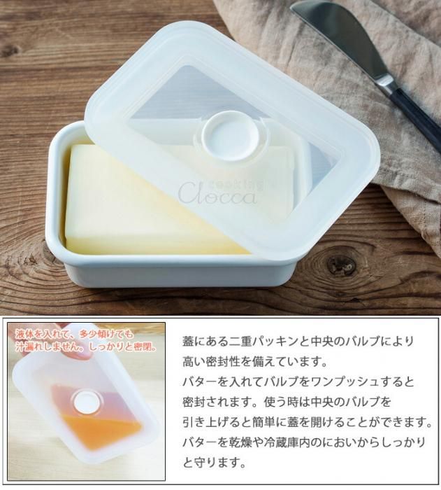 富士ホーロー 密封 バターケース 200g 送料無料 当日出荷 分類で探す キッチングッズ キッチン小物 保存容器 バターケース ブランドで探す 富士ホーロー 価格帯(税込) 2,000円台の商品 キッチン 送料無料 ラッピング承ります 密封できるホーロー製のバターケースです 中央のバルブをワンプッシュしてしっかり密封できます 市販のバター200gがきれいに収まりますn-200 メーカー希望小売価格2,750円(税込) 2,530円(税込)0円 バターケース200在庫2,530円(税込)取り寄せ2,530円(税込) 数量 カートに入れる 製品について性能詳細お買い物ガイドクロッカについて商品説明密封できるホーロー製のバターケースです。ホーローは素地が鉄、表面がガラス質でできています。つるりとして汚れがつきにくく、油脂が付着しても清潔に使えます。蓋の二重パッキンと中央のバルブが密封度を高めています。液体を入れて多少傾けても汁漏れしない高い密封性で、バターを乾燥やにおいからしっかり守ります。 バターを入れて中央のバルブをワンプッシュするとしっかりと密閉されます。使う時は中央のバルブを引き上げると簡単に蓋を開けることができます。 サイズ約 15.0 × 10.0 × 6.5cm 満水容量約0.42L 材質「本体」ほうろう用鋼板、「蓋」ポリプロピレン・シリコン 重量約0.3kg(小箱込み) 特長表面が硬く、すべすべしたガラス質なので、雑菌が繁殖しにくく、衛生的です。酸や塩に極めて強く、非吸着性が抜群で、容器にニオイがつきません。ガラス質は中性で不活性。食品と化学反応を起こしにくいので味を損なうことがありません。耐久性が抜群なので、オーブンや冷凍庫での保存にも使えます。 ホーローについて手作業で釉薬を掛けるため、ひとつひとつの表情には多少の個体差が生じます。ホーローの性質上、焼成時に黒点や色むらの様に見える部位が生じる場合がございます。本体フチ部分は鋼板の切り口となり、釉薬がかかりにくく下地の黒いスジが多少見られますが黒い部分もホーロー加工が施されております。上記の様な場合でも不良ではなくご使用には問題ございませんので安心してお使い下さい。 備考食洗機、電子レンジ使用不可オーブン調理可能(フタを外す)耐冷温度:-20℃日本琺瑯工業会認定Sマーク取得 製造元富士ホーロー -ふじほうろうふじほーろーRERATED ITEMS関連商品富士ホーロー 密封 バターケース 450gスケーター ふわふわバターメーカーカジュアルプロダクト アクリル バターディッシュタワー バルブ付き密閉バターケース 4821/4822ミッフィーフェイス バターケース 200g用 BTG1イイトコ バターケース コンテナー AS0043タワー バルブ付き密閉業務用バターケース 5376/5377タク バターケース 27736 27737カットできちゃうバターケース ST-3005 曙産業