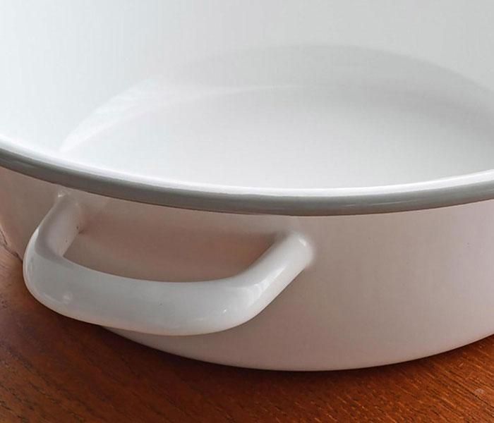 持ち運びに便利な取っ手ハンドル付きのホーロー製たらいです。縁は可愛らしいグレーカラーが施されています。