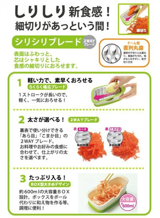 シリシリブレードは表面はふわっと、芯はシャキリ食感の細切りにおろせるブレードです。ドーム型の直列丸歯が、通常の千切りとは異なり、表面がちぢれて、味がなじみやすい削ぎ切り方式で、野菜をおろします。沖縄の郷土料理、「人参しりしり」も簡単に作れます。
