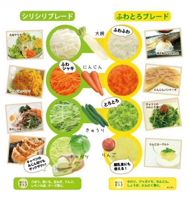 各ブレードは両面で異なる仕上がりができ、用途や野菜ごとに異なった仕上がりを作ることができます。