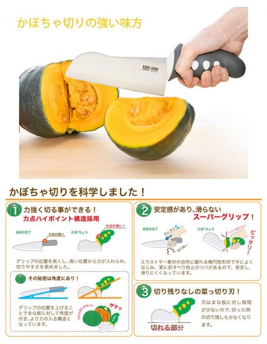 「かぼ-ちょう」は、かぼちゃなど硬い野菜を力を掛けずにザクザク切れる包丁です。