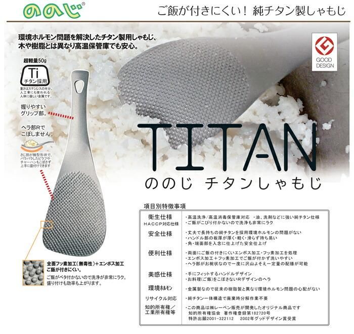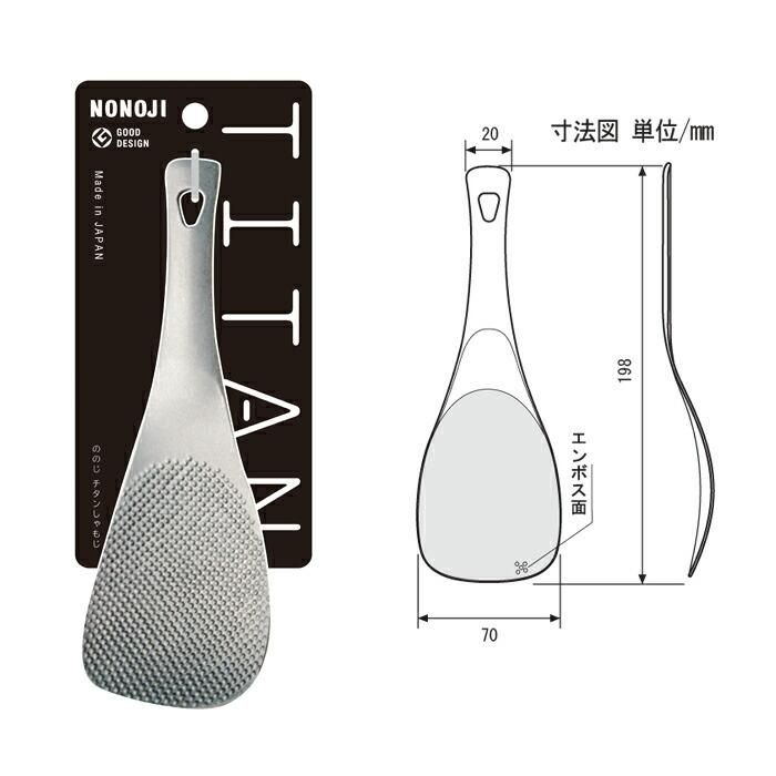 人工骨にも使われるチタンの軽さと強固さを兼ね備え、両面にエンボス加工とフッ素加工を施し、ご飯がくっつきにくい仕上げとなっています。