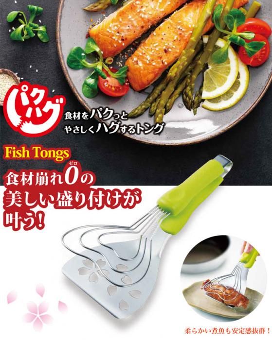 パグハグフィッシュトングは、焼き魚など崩れやすい食材をやさしく包み込み、食材崩れ0で美しい盛り付けができるトングです。