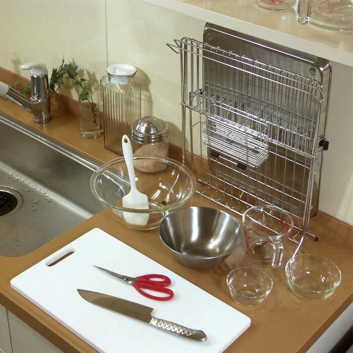 狭いスペースを有効に使え、お料理に使用した道具も整理しながら一緒に乗せられる大容量の水切りラック