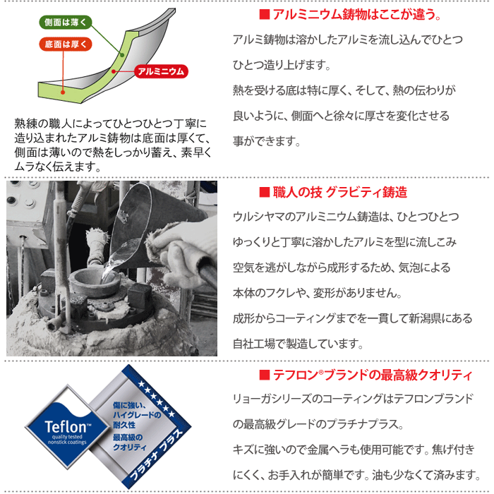 リョーガ 炒め鍋 28cm 送料無料 当日出荷 分類で探す キッチングッズ フライパン ブランドで探す ウルシヤマ金属工業 リョーガ RYO-GA 価格帯(税込) 6,000円台の商品 キッチン用品 送料無料 ラッピング承ります ウルシヤマ金属工業 リョーガシリーズ ガス火調理に最適な厚板アルミ鋳物のフライパンです 特厚底で熱を蓄え 側面は薄く軽量化 全面を均一に加熱します ryoga-253394 メーカー希望小売価格7,700円(税込) 6,050円(税込) 0円 いため鍋28cm在庫6,050円(税込)在庫なし取り寄せ6,050円(税込)在庫なし SOLD OUT 製品について性能詳細お買い物ガイドクロッカについて 商品説明 ウルシヤマ金属工業のリョーガシリーズ。ガス火調理に最適な厚板アルミ鋳物製のフライパンシリーズです。軽量設計で調理中にフライパンをあおる時、後片付けをする時の負担を軽減。女性にも扱いやすい軽さです。熟練の職人によってひとつひとつ丁寧に造り込まれたアルミ鋳物(アルミキャスト)は底面は厚く、側面を薄く仕上げてあります。底面にいくに従って徐々に厚みが増して、全面を均一に加熱します。リョーガシリーズは11アイテムの豊富なバリエーション。調理用途を考慮し、加熱性能と扱いやすさのベストバランスをめざしているため、アイテム毎に底面の厚さが異なります。コーティングは信頼のテフロンブランドの中でも最高級グレードのプラチナプラス。キズに強く金属ヘラの使用も可能。焦げ付きにくく、お手入れが簡単です。油も少しでよいので、ヘルシークッキング。外面はダイヤモンド粒子配合のふっ素樹脂加工で、汚れがこびりつきにくく、サッと洗い流すことができます。炒め鍋は底が深くてこぼれにくく、あおりやすい形状です。その名の通り炒め物調理におすすめです。 特長 丈夫で長持ちするグラビティ鋳造ウルシヤマのアルミ鋳造はひとつひとつゆっくりと丁寧に溶かしたアルミを型に流し込み、重力のみで空気を逃がしながら成形しているため、気泡による本体のフクレや変形がありません。 鋳物が冷える過程で、外側は早く冷えて密な硬い組織となります。そのため耐久性に優れ丈夫な仕上がりに。また内側はゆっくりと粗い組織となり、熱保有力に優れています。新潟の自社工場で職人により丁寧に造られており、大量生産は行わず品質の良さを追求した安心安全の高品質な国産フライパンです。 材質本体:アルミニウム合金(底厚3.1mm)本体内面:ふっ素樹脂塗膜加工(テフロンプラチナプラス)本体外面:ふっ素樹脂塗膜加工ハンドル:フェノール樹脂 サイズ全長49.5cm、外径29cm、ハンドルまでの高さ12cm内面深さ7.3cm、本体高さ7.6cm焼き面サイズ直径約16cm 満水容量3.4L 商品重量約820g 備考 日本製 ガス火専用 タイプ サイズディープフライパン 22cm 炒め鍋 24cm 炒め鍋 28cm 炒め鍋 30cmRERATED ITEMS関連商品