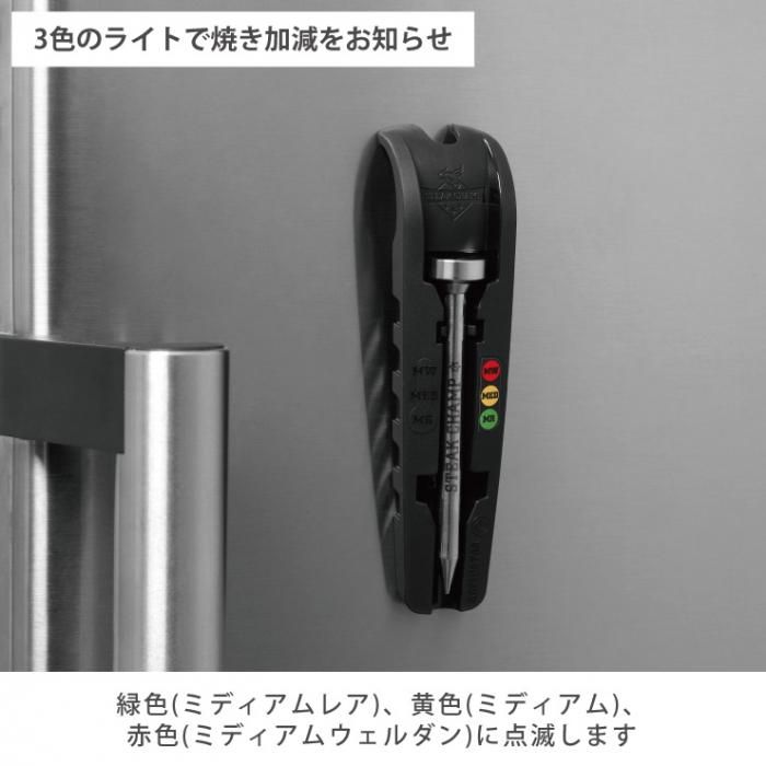 内蔵されたLEDライトが点滅して正確に焼き加減を教えてくれます。(緑色が点滅したらミディアムレア。黄色が点滅したらミディアム。赤色が点滅したらミディアムウェルダン。)