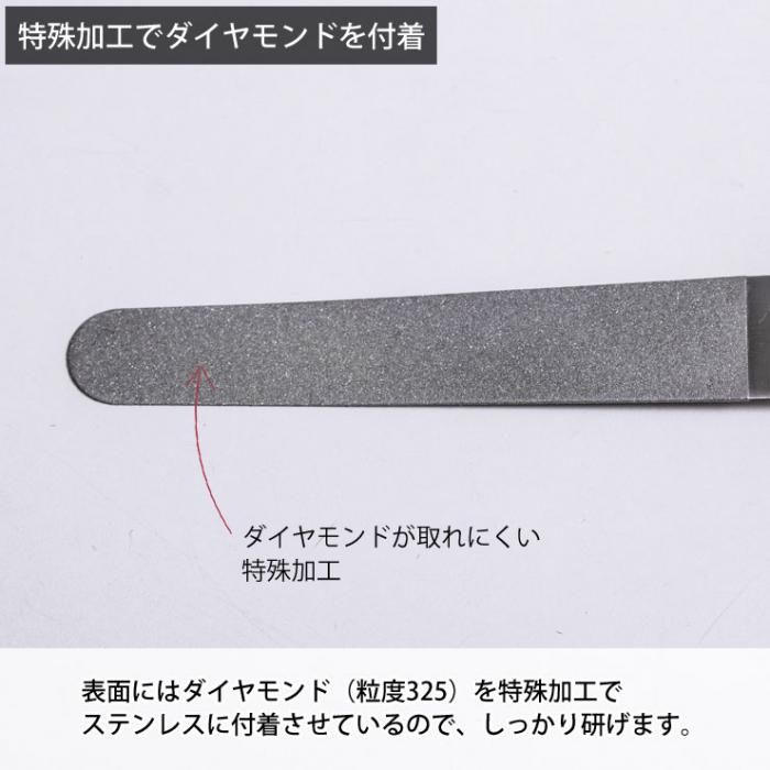 研ぎたい刃先に当てれば、包丁研ぎに最適な角度にしなるので簡単に研げます。表面にはダイヤモンド(粒度325)を特殊加工でステンレスに付着させているので、しっかり研げます。