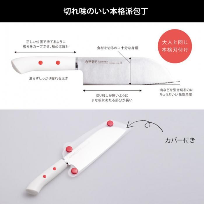 台所育児の包丁は子どもの少ない力でもよく切れるように、刃物のまち岐阜県関市で作られる切れ味のよい本格派包丁です。