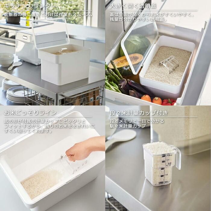 タワー 密閉 シンク下米びつ 5kg 3377/3378 送料無料 当日出荷 分類で探す キッチングッズ キッチン小物 保存容器 米びつ ブランドで探す 山崎実業 タワー tower 価格帯(税込) 3,000円台の商品 キッチン用品 送料無料 ラッピング承ります シンク下引き出しに合うスタイリッシュな米びつ 炊飯器の横に置いてもなじむデザイン 底の形が計量カップにピッタリとフィットするから お米が最後まできれいにすくえますtower_3377-8 3,300円(税込)0円 選択ホワイト3,300円(税込)ブラック3,300円(税込)ホワイト(取り寄せ)3,300円(税込)ブラック(取り寄せ)3,300円(税込) 数量 カートに入れる 製品について性能詳細お買い物ガイドクロッカについて 商品説明 システムキッチンの引き出しに合うスタイリッシュな米びつ。パッキンでしっかり密閉され、お米が最後まできれいにすくえます。蓋をパチッとロックしておけば、お米を湿気と酸化から防いでくれます。キッチンカウンターなど炊飯器の横に置いてもスタイリッシュで作業もスムーズ。蓋は全面が開くからお米がすくいやすく、残量が分かりやすい透明蓋。段差メモリで一目で分かる段々米計量カップが付属しています。すり切り一杯で1合、段差部分で半合です。普通米と無洗米が測れます。底面のお米ごっそりラインで、底の形が付属の計量カップにピッタリとフィットするから、残りのお米をきれいにすくい取ってくれます。 材質本体・蓋:ABS樹脂 、パッキン:シリコーン計量カップ:アクリル樹脂 サイズ約 W30 × D19.7 × H19.2cm 容量6L(お米:約5kg) 耐熱温度本体:-40度〜90度計量カップ:-40度〜100度 商品重量約905g 生産国中国 ブランド 製造元tower -タワー 山崎実業RERATED ITEMS関連商品スケーター 袋のまんま米びつ 防虫 5kg 計量カップ付き DRF5スケーター 袋のまんま米びつ 防虫 10kg 計量カップ付き DRF10スケーター 防虫米びつ 2kg用 計量カップ付き セリュー MAX3kgまでスケーター 防虫米びつ 5kg用 MAX7.5kgまでプレート 密閉 シンク下米びつ 5kg 3379タワー 1合分別 冷蔵庫用米びつ 3760/3761プレート 1合分別 冷蔵庫用米びつ 3822タワー 密閉米びつ 10kg 5423/5424