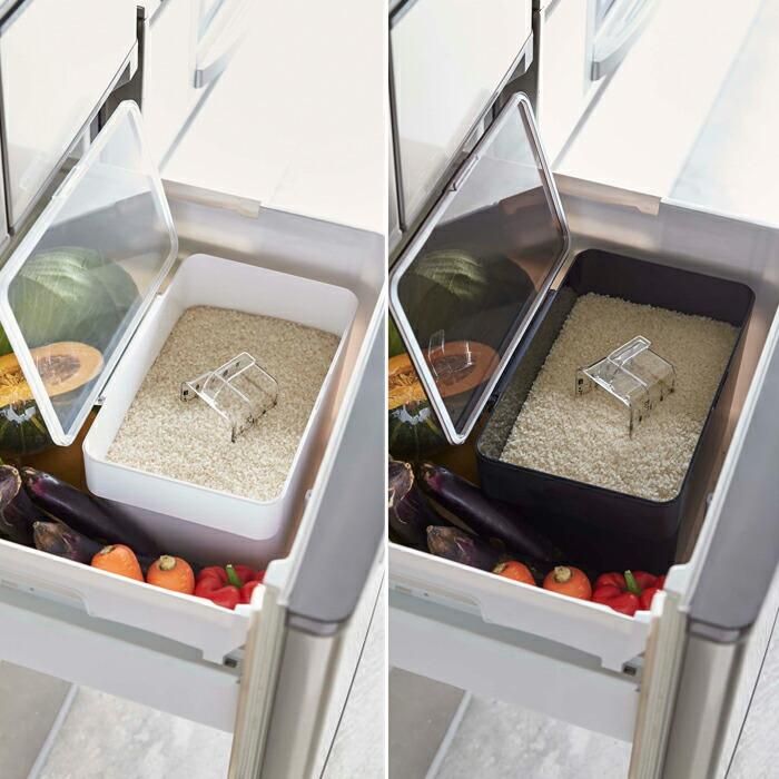 システムキッチンの引き出しに合うスタイリッシュな米びつ。パッキンでしっかり密閉され、お米が最後まできれいにすくえます。