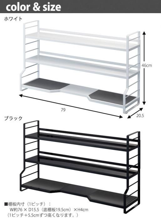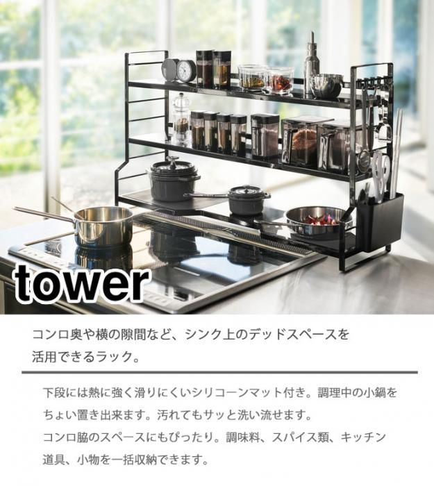 タワー コンロ奥ラック 3段 3593/3594 当日出荷 分類で探す キッチングッズ キッチン収納 すき間収納 ブランドで探す 山崎実業 タワー tower 価格帯(税込) 1万円台の商品 キッチン用品 ラッピング承ります コンロ奥や横の隙間など シンク上のデッドスペースを活用できるラック 鍋やフライパンのちょい置きや調味料やスパイス類などを一括収納できます tower-3593-4 11,990円(税込) tower-3593-4ホワイト11,990円(税込)在庫なしブラック11,990円(税込)在庫なしホワイト(取り寄せ)11,990円(税込)ブラック(取り寄せ)11,990円(税込) 数量 カートに入れる 製品について性能詳細お買い物ガイドクロッカについて 商品説明 コンロ奥や横の隙間など、シンク上のデッドスペースを活用できるラック。下段には熱に強く滑りにくいシリコーンマットがついているので、鍋置きなどにおすすめ。汚れてもサッと洗い流せます。コンロ脇のスペースにもぴったり。調味料類、スパイス類、キッチン道具、小物を一括収納できます。棚の高さは約5cm間隔で変えられて収納するものに合わせてカスタマイズできます。 材質本体:スチール(粉体塗装)、マット:シリコーン、カトラリーポケット:ABS樹脂 耐熱温度本体:200℃、カトラリーポケット:90℃ サイズ約 W79×D20.5×H46cm 対応サイズ幅約76cmまでのビルトインガスコンロ、IHクッキングヒーターに対応 棚板内寸約 W76×D15.5(底棚板19.5)×H4cm(1ピッチ+5.5cmずつ高くなります。) 商品重量約5.4kg 耐荷重各棚:約5kg、フック1つあたり:約500g 備考付属品:フック×5組立式 ブランド 製造元tower -タワー 山崎実業RERATED ITEMS関連商品タワー コンロ奥ラック L 7218/7219タワー コンロ奥ラック S 7220/7221タワー キッチンコーナーラック 7453/7454