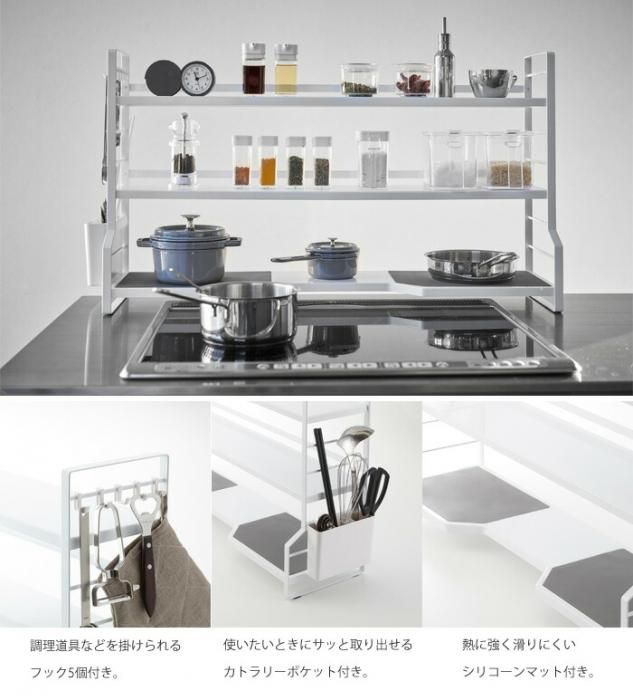 タワー コンロ奥ラック 3段 3593/3594 当日出荷 分類で探す キッチングッズ キッチン収納 すき間収納 ブランドで探す 山崎実業 タワー tower 価格帯(税込) 1万円台の商品 キッチン用品 送料無料 ラッピング承ります コンロ奥や横の隙間など シンク上のデッドスペースを活用できるラック 鍋やフライパンのちょい置きや調味料やスパイス類などを一括収納できますtower-3593-4 11,990円(税込) tower-3593-4ホワイト11,990円(税込)在庫なしブラック11,990円(税込)在庫なしホワイト(取り寄せ)11,990円(税込)ブラック(取り寄せ)11,990円(税込) 数量 カートに入れる 製品について性能詳細お買い物ガイドクロッカについて商品説明コンロ奥や横の隙間など、シンク上のデッドスペースを活用できるラック。下段には熱に強く滑りにくいシリコーンマットがついているので、鍋置きなどにおすすめ。汚れてもサッと洗い流せます。コンロ脇のスペースにもぴったり。調味料類、スパイス類、キッチン道具、小物を一括収納できます。棚の高さは約5cm間隔で変えられて収納するものに合わせてカスタマイズできます。 材質本体:スチール(粉体塗装)、マット:シリコーン、カトラリーポケット:ABS樹脂 耐熱温度本体:200℃、カトラリーポケット:90℃ サイズ約 W79×D20.5×H46cm 対応サイズ幅約76cmまでのビルトインガスコンロ、IHクッキングヒーターに対応 棚板内寸約 W76×D15.5(底棚板19.5)×H4cm(1ピッチ+5.5cmずつ高くなります。) 商品重量約5.4kg 耐荷重各棚:約5kg、フック1つあたり:約500g 備考付属品:フック×5組立式 ブランド 製造元tower -タワー 山崎実業RERATED ITEMS関連商品タワー コンロ奥ラック L 7218/7219タワー コンロ奥ラック S 7220/7221タワー キッチンコーナーラック 7453/7454